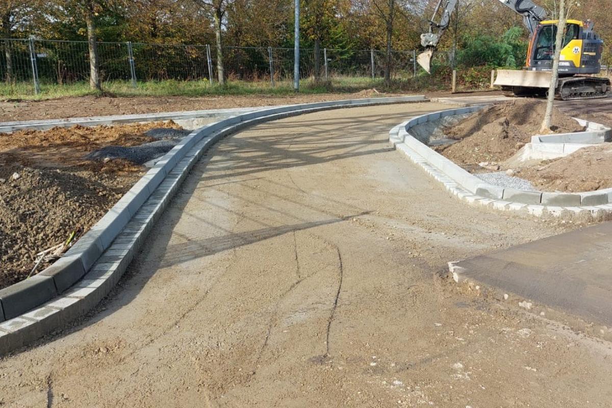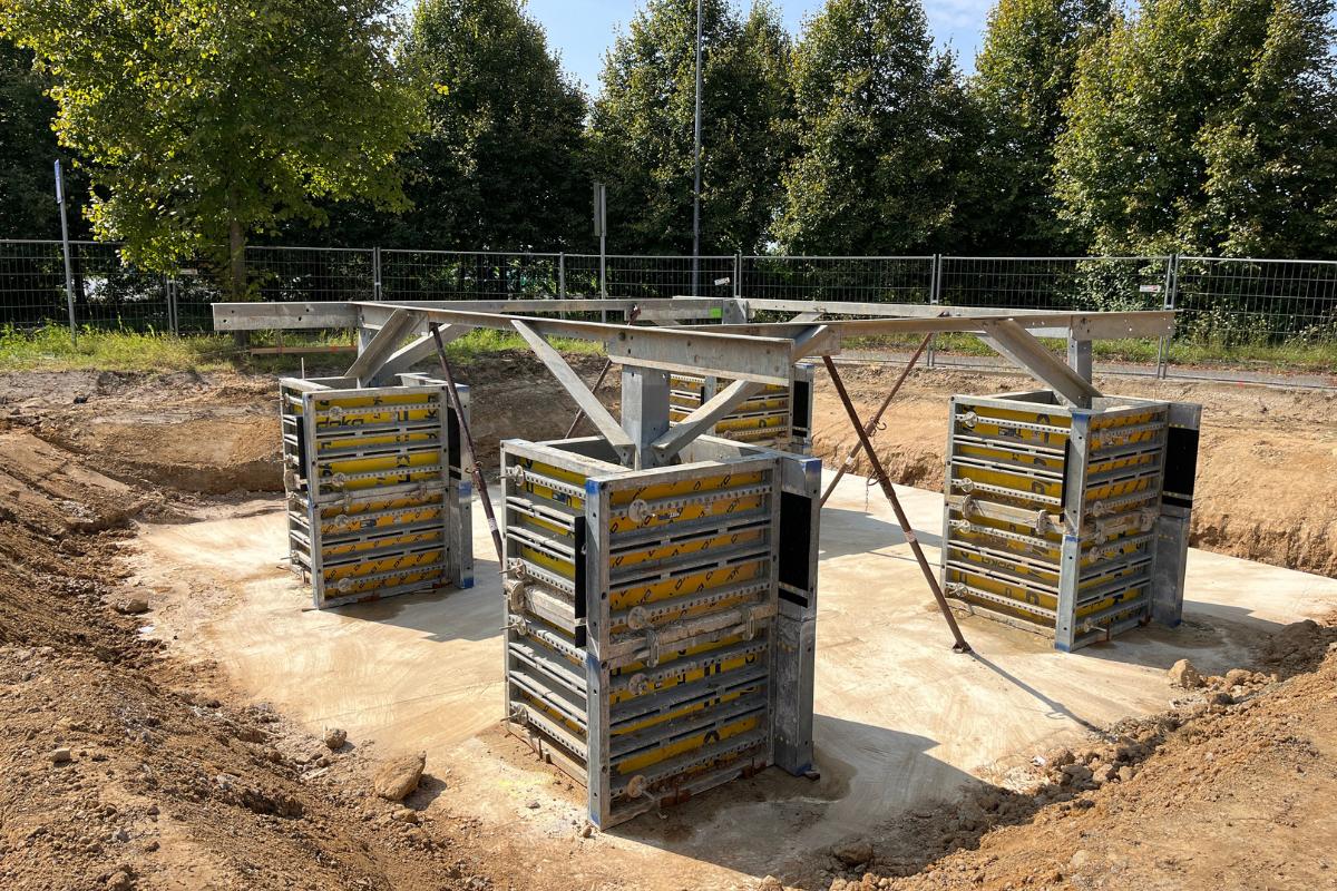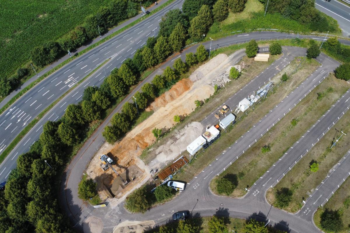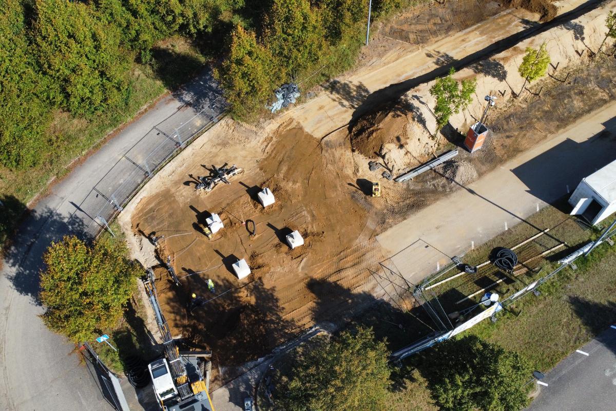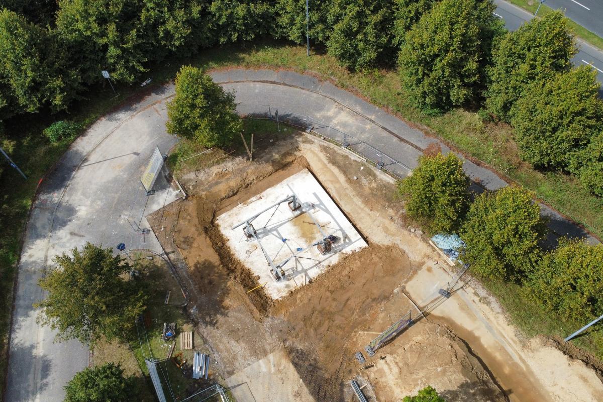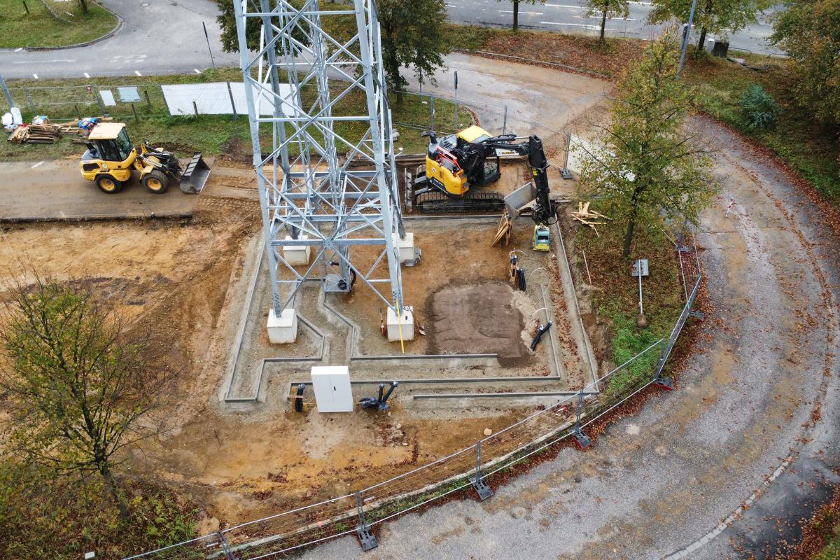 Dafür wurden auf der Fläche zunächst Rodungsarbeiten durchgeführt, bevor die Baugrubenherstellung inklusive der Bodenausgleichsschicht erfolgen konnte. Zudem wurden Fundamentplatten mit vier aufgehenden Auflagern für den Mastbau gesetzt. Im weiteren Verlauf wurden Leerrohrtrassen verlegt und die Oberfläche hergestellt. Im Anschluss erfolgten Asphaltarbeiten.